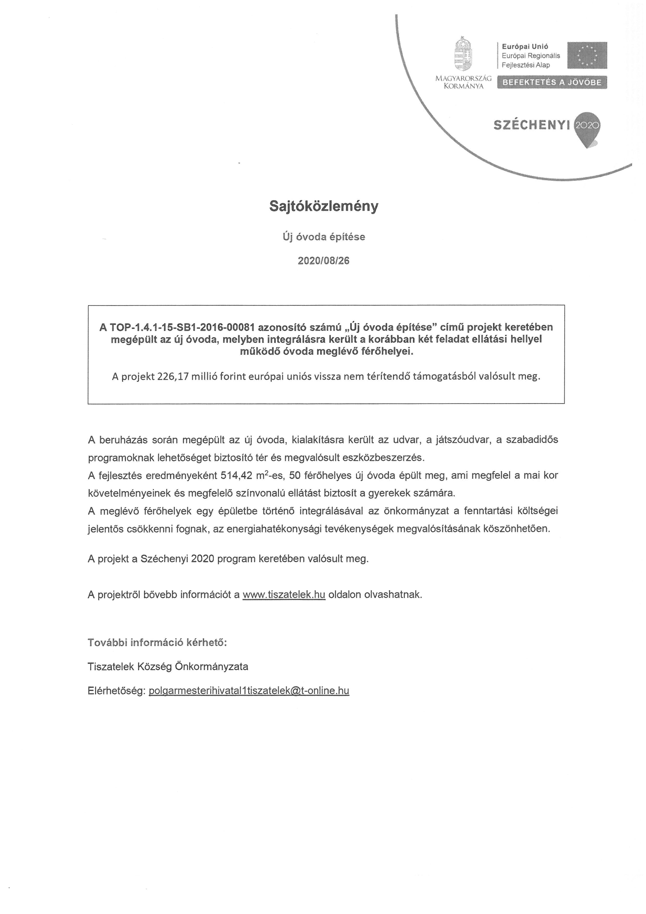 Kedvezményezett neve: Tiszatelek Község Önkormányzata